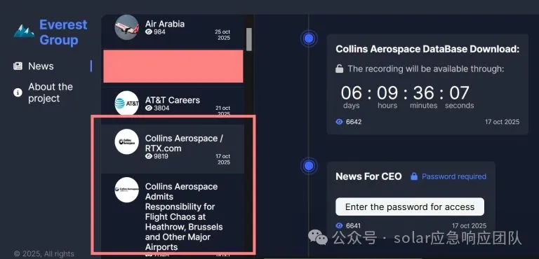 Everest泄露网站上关于Collins Aerospace攻击的条目