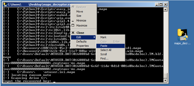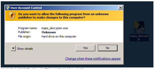 - 在受感染的计算机上运行mapo_decryptor.exe (您在步骤 2 中下载的)。