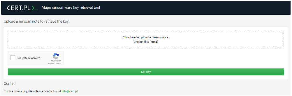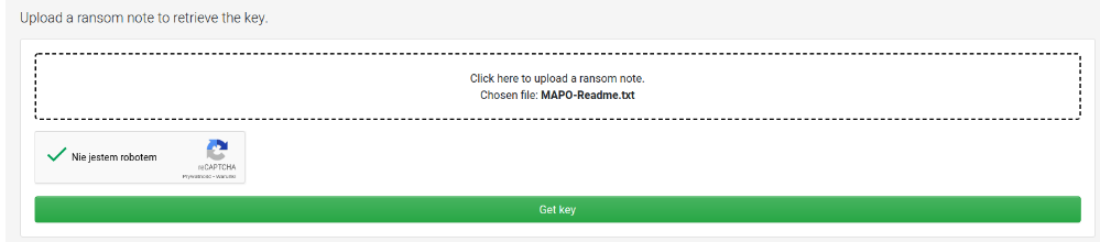 Mapo勒索软件加密受害者的文件后,会在文件名后附加“.mapo”扩展名,并生成一个名为“MAPO-Readme.txt”的赎金说明文件。该文件中包含了支付赎金的详细指示和解密密钥的获取方法。通常,受害者被引导至一个特定网站,以获取解密所需的密钥。幸运的是,CERT Polska开发了一款免费解密工具,可以帮助受害者在无需支付赎金的情况下恢复其文件。使用此工具,受害者可以通过上传其赎金说明文件来获取解密密钥,从而安全地恢复被加密的数据。