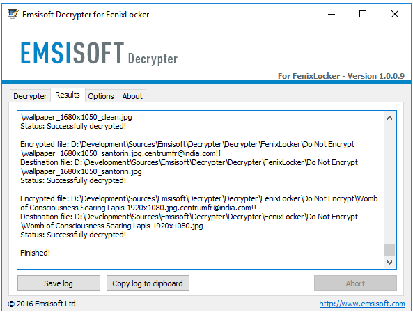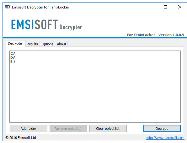 - 解密器通常根据特定的恶意软件系列提供各种选项。可用选项位于“选项”选项卡中,可以在那里启用或禁用。您可以在下面找到可用选项的详细列表。