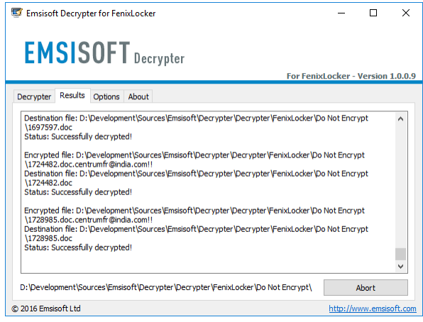 - 将要解密的所有位置添加到列表中后,单击“解密”按钮开始解密过程。屏幕将切换到状态视图,通知您文件的当前进程和解密状态: