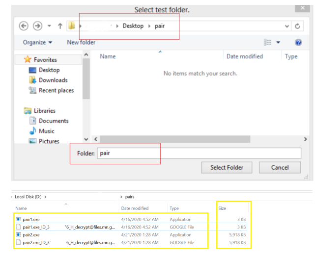 “测试文件夹”必须包含两对原始/加密文件,用于确定解密类型。此文件夹必须仅包含两对: