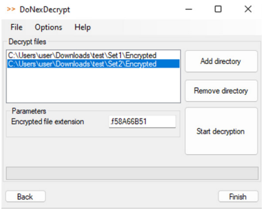 11. 在解密界面上,您可以更改加密文件扩展名,以防它与目录中的加密文件不匹配。按“添加目录”将目录添加到解密器将扫描加密文件的目录中,按“删除目录”以删除目录列表中突出显示的条目。一旦扫描列表中至少有一个目录,将启用“开始解密”按钮,并可以按下开始解密: