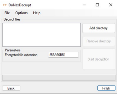 如果网络连接设备或共享上的文件被来自受感染计算机的勒索软件加密,则可以使用从本地磁盘加密的文件中恢复的密钥来解密这些文件。但是,远程加密的文件遵循不同的解密过程,可以通过更改其配置文件来指示解密器使用该过程。该文件在DoNexDecryptor.zip文件中提供,并命名为 DoNexDecrypt.exe.config: