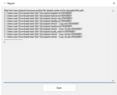 13. 选择“是”将显示一个窗口,列出遇到的问题以及受影响的加密文件。可以在同一个窗口保存报告的.txt文件。