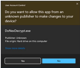 3. 双击后,解密器将请求以管理员用户身份运行的权限。这对于确保解密器可以解密尽可能多的文件是必要的。通过接受 UAC 提示,允许解密器运行:
