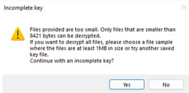 8. 如果所选文件样本生成的密钥不足以解密所有文件,则解密器将提示您可以解密的最大文件大小(以字节为单位)。您可以单击“是”以继续使用不完整的密钥,或者选择原始文件版本大小至少为 1MB 的样本: