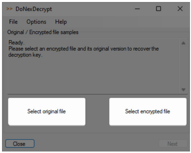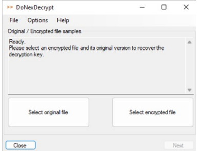 6. 在第一个界面上,您可以选择用于密钥恢复的文件样本。这个文件样本包括一个被恶意软件加密的文件以及该文件在加密之前的原始版本。确保您手头至少有一个这样的样本。您可以使用满足这些条件的任何可用文件,但建议使用原始未加密版本大小至少为 1MB 的样本。通过这样做,解密器可以使用与示例文件相同的密钥解密恶意软件加密的所有文件。否则,解密器将无法解密比给定样本中的原始未加密文件更大的文件。